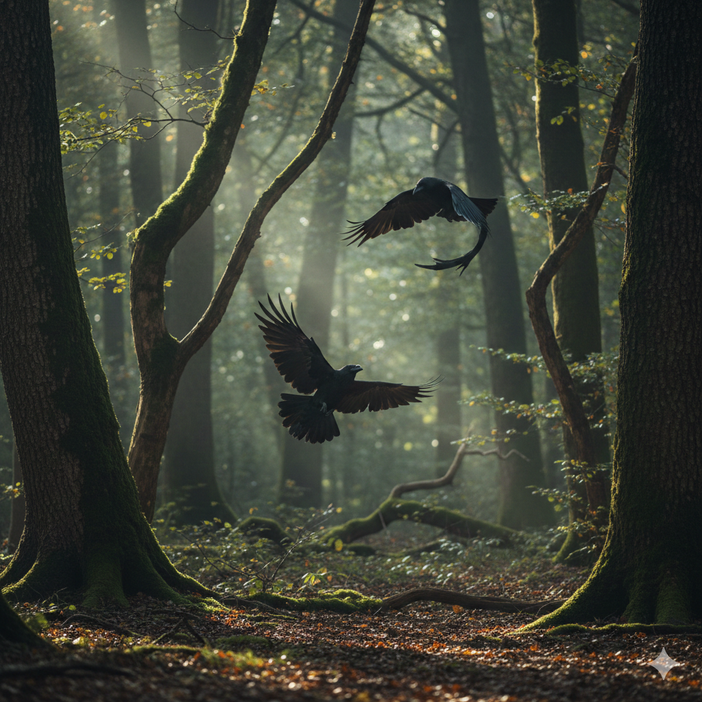 Odin lauschte schweigend. Er wusste: Nur wer den Gedanken (Huginn) und die Erinnerung (Muninn) im Gleichgewicht hält, besitzt wahre Weisheit. Er fütterte sie mit einem Stück Fleisch vom Tisch der Götter, und die beiden Raben schlossen die Augen, um bis zum nächsten Morgengrauen zu ruhen.